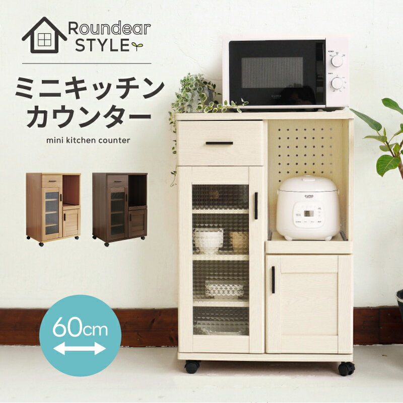 Roundear キャスター付き キッチンカウンター 幅60cm コンセント付き 幅60cm 間仕切り コンパクト 収納 レンジ台 炊飯器ラック スリム 便利 家電収納 キッチンワゴン 収納